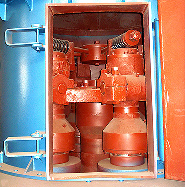 工作時,將需要粉碎的物料從機罩殼側面的進料斗加入機內,依靠懸掛在主機梅花架上的磨輥裝置,繞著垂直軸線公轉,同時本身自轉,由于旋轉時離心力的作用,磨輥向外擺動,緊壓于磨環(huán),使鏟刀鏟起物料送到磨輥與磨環(huán)之間,因磨輥的滾動碾壓而達到粉碎物料的目的。